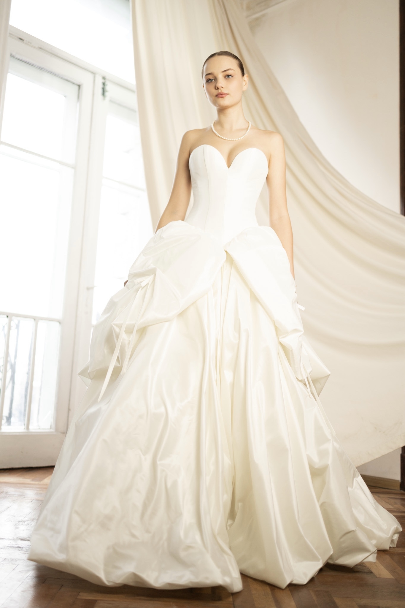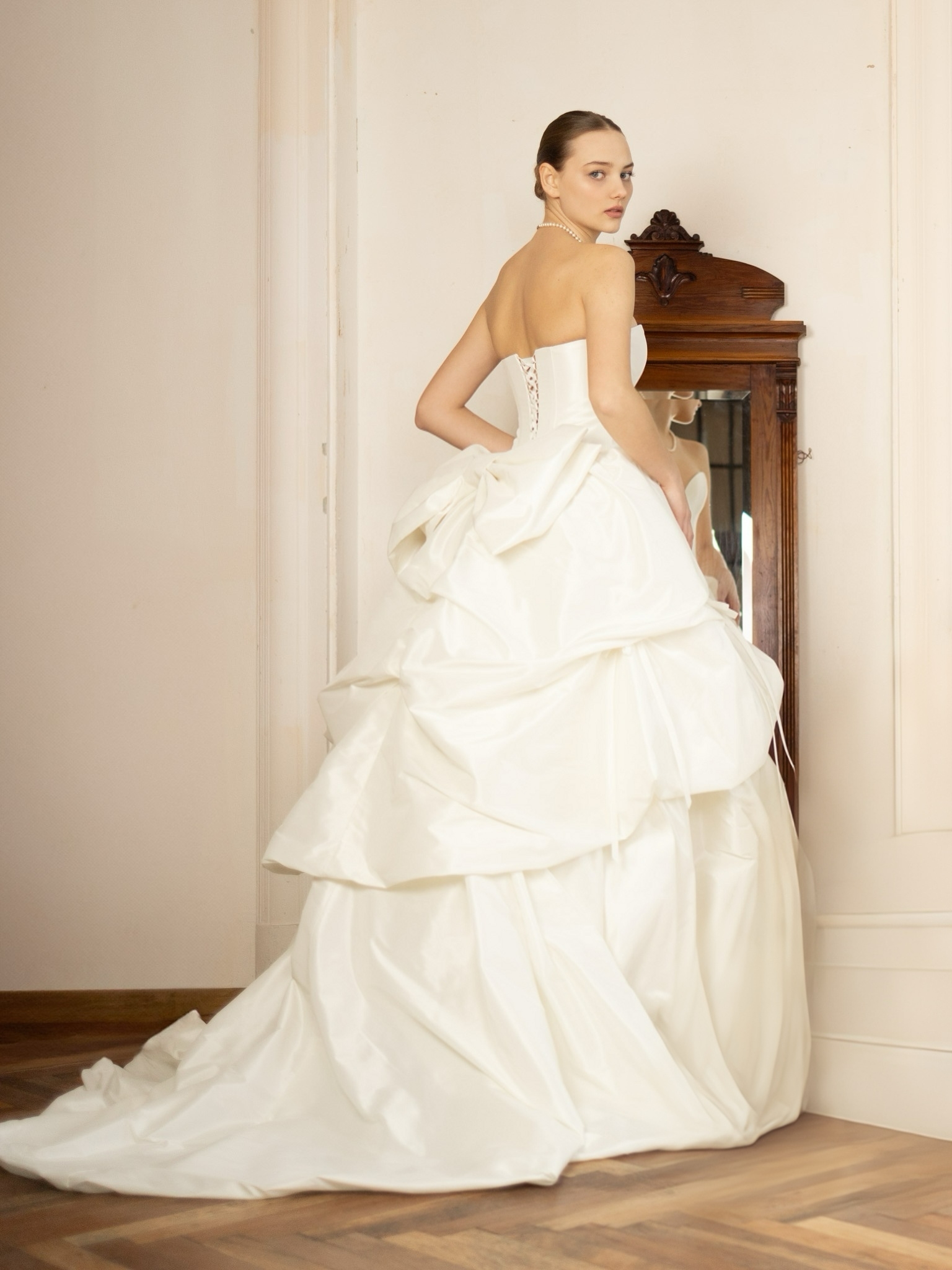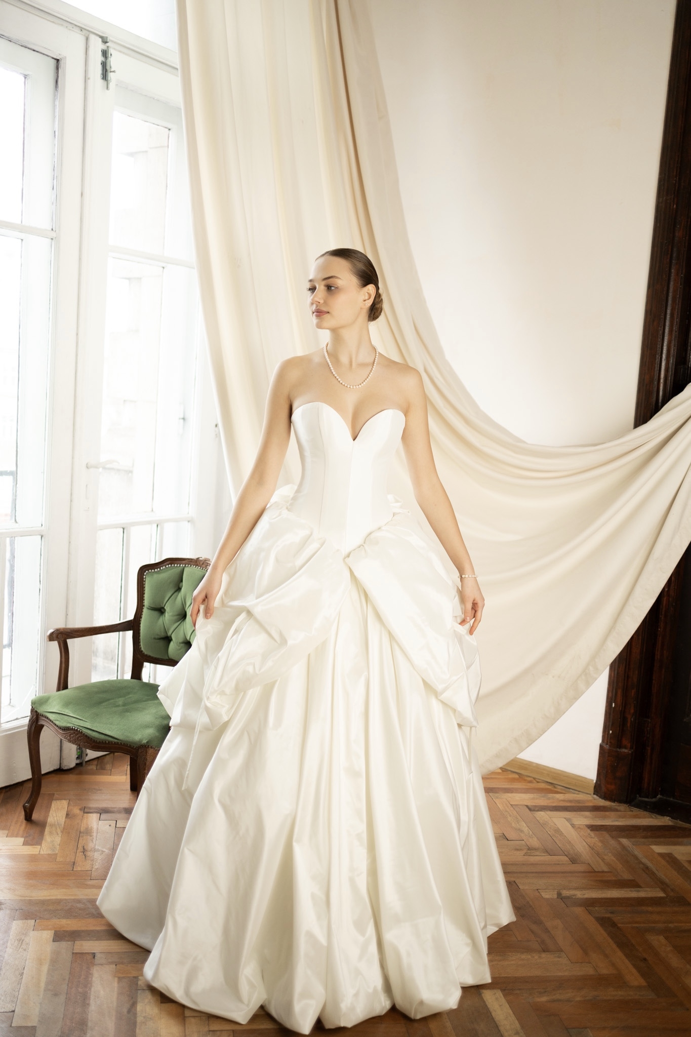 A romantic strapless ball gown with sculptural draping and a timeless corset bodice, designed for the modern bride with a love for classic elegance.