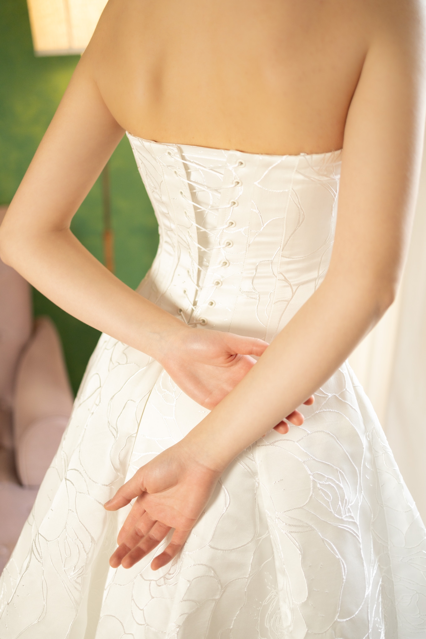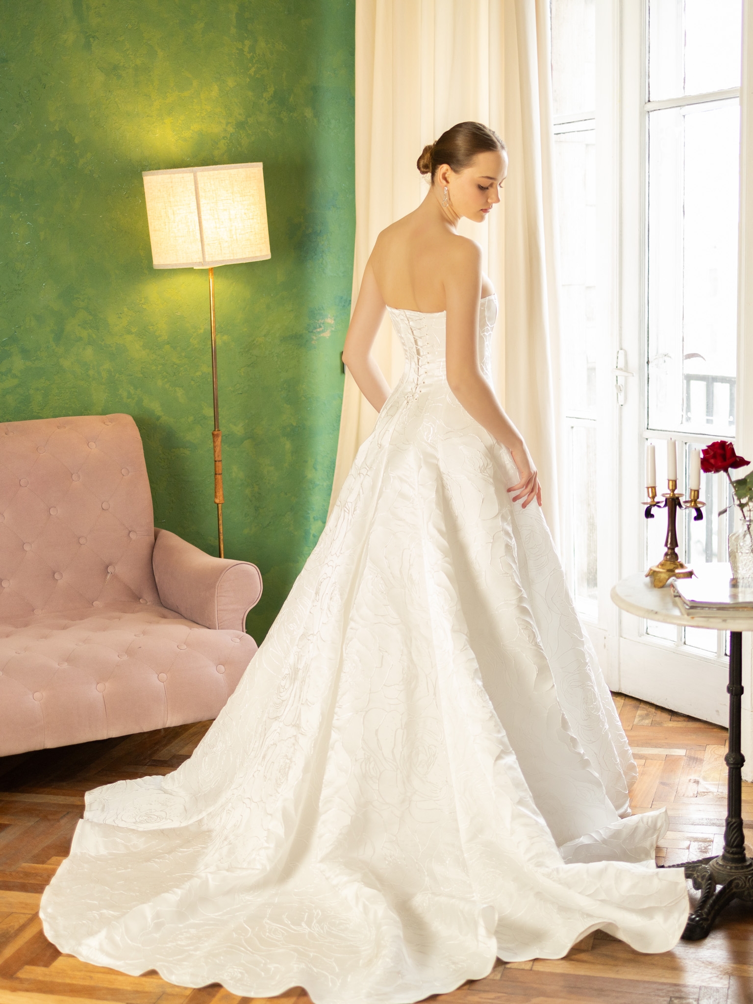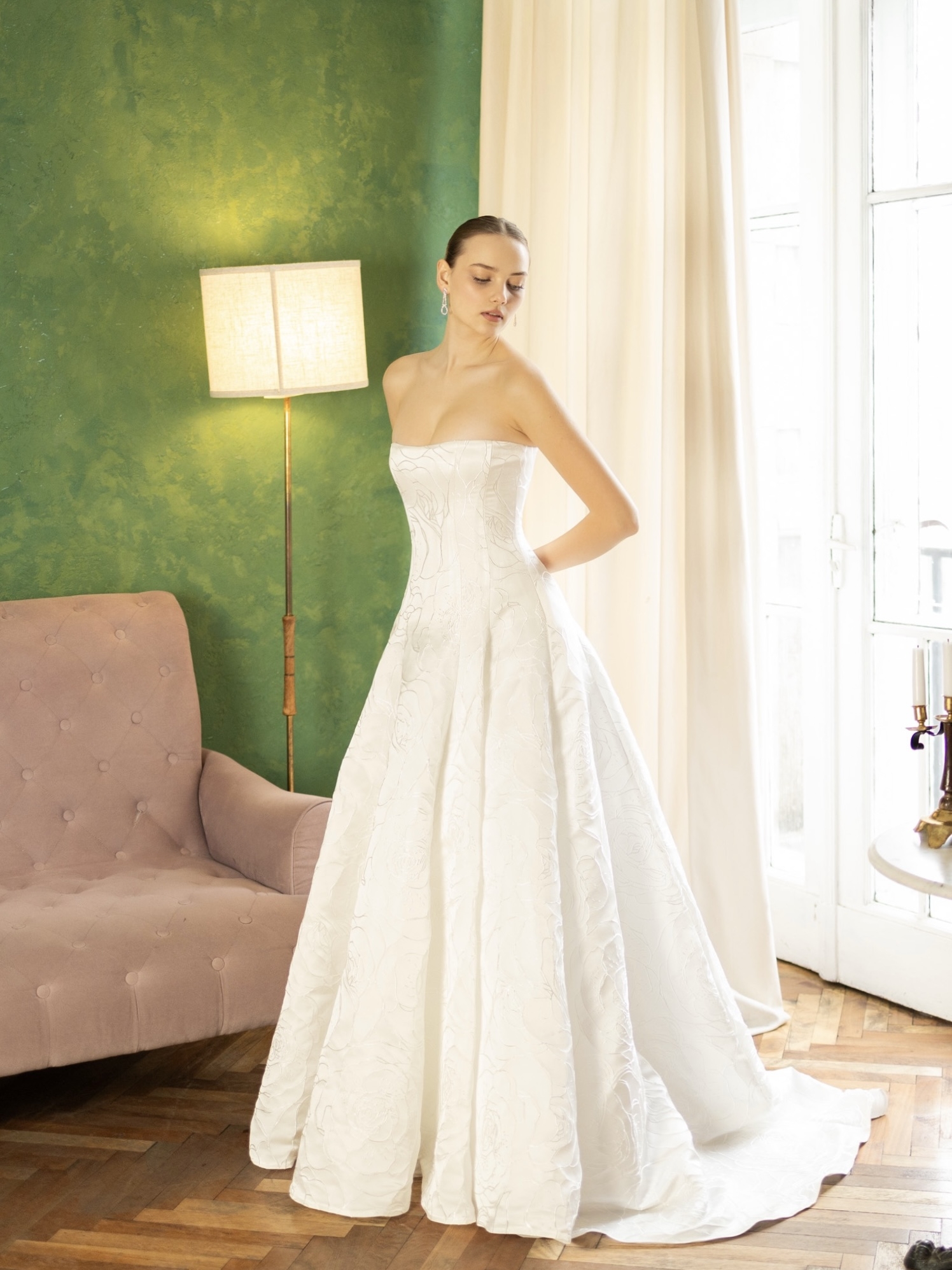 A timeless strapless A-line gown with delicate floral texture and a sculpted bodice, designed for effortless elegance and refined romance.