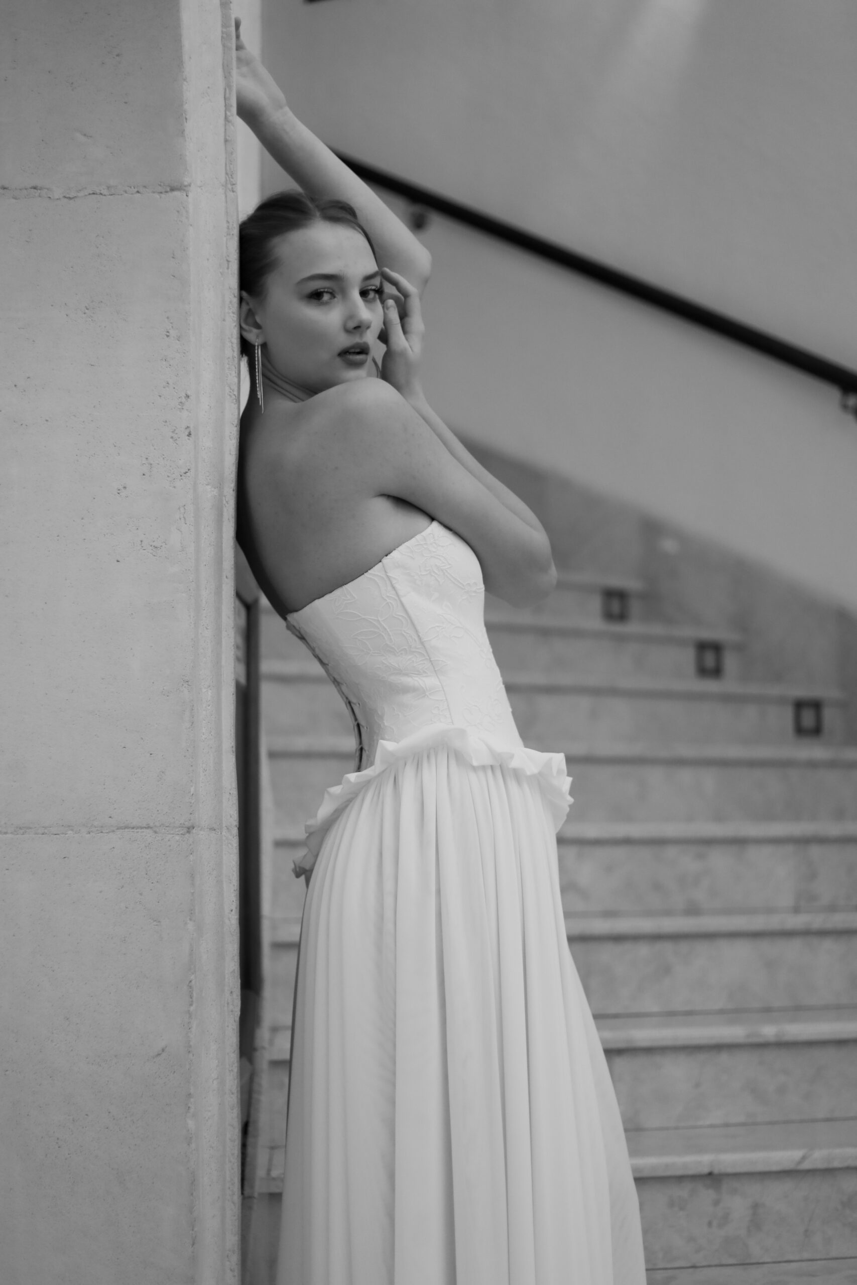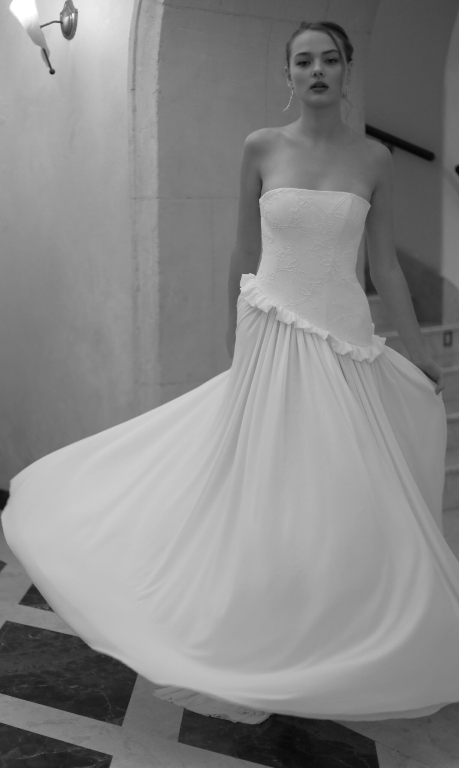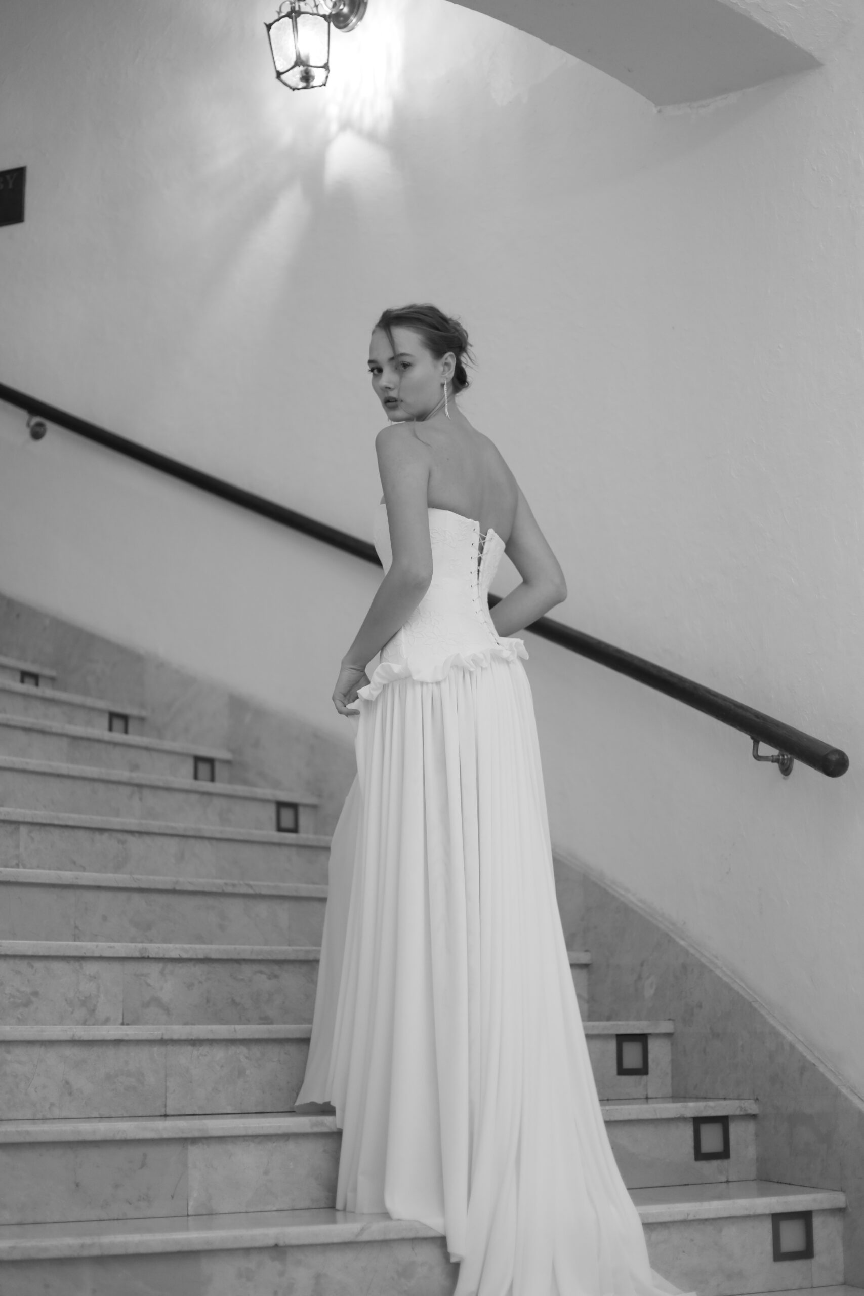The corset-style lace-up back adds a romantic couture detail, allowing for a perfectly adjustable fit, while the full flowing skirt creates a soft, graceful movement with every step. Crafted for brides who appreciate understated luxury, Ariana balances classic bridal tradition with contemporary sophistication.