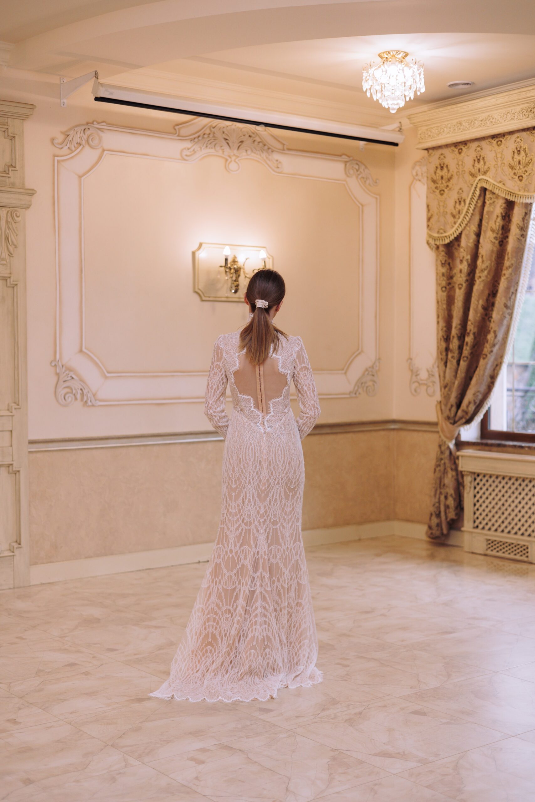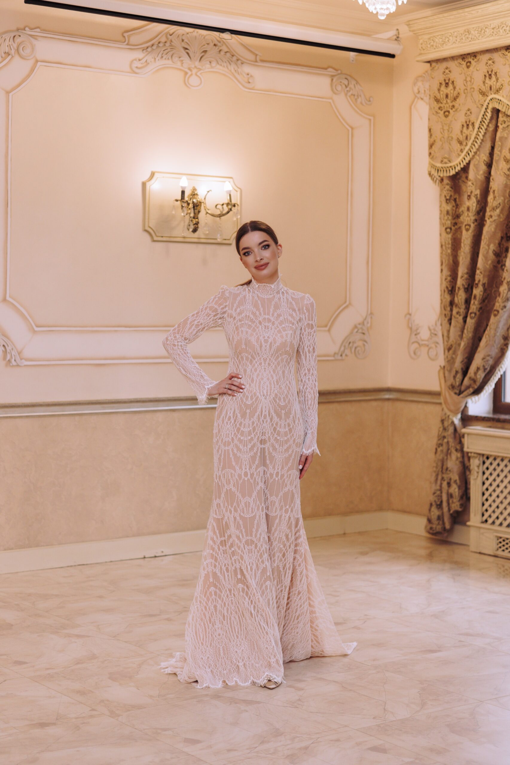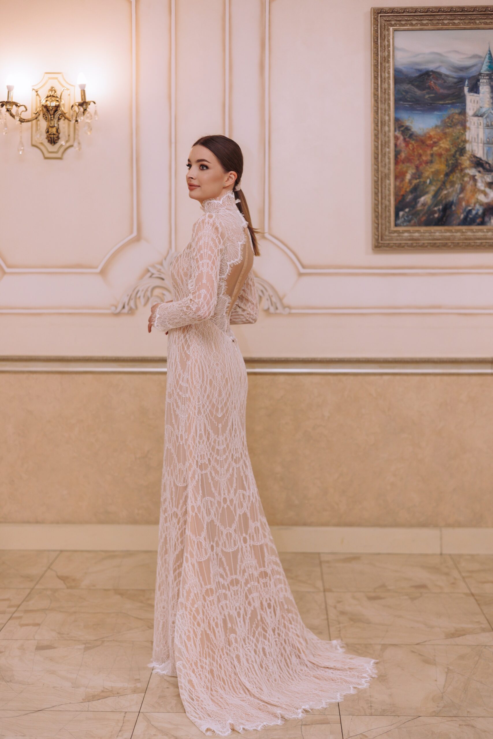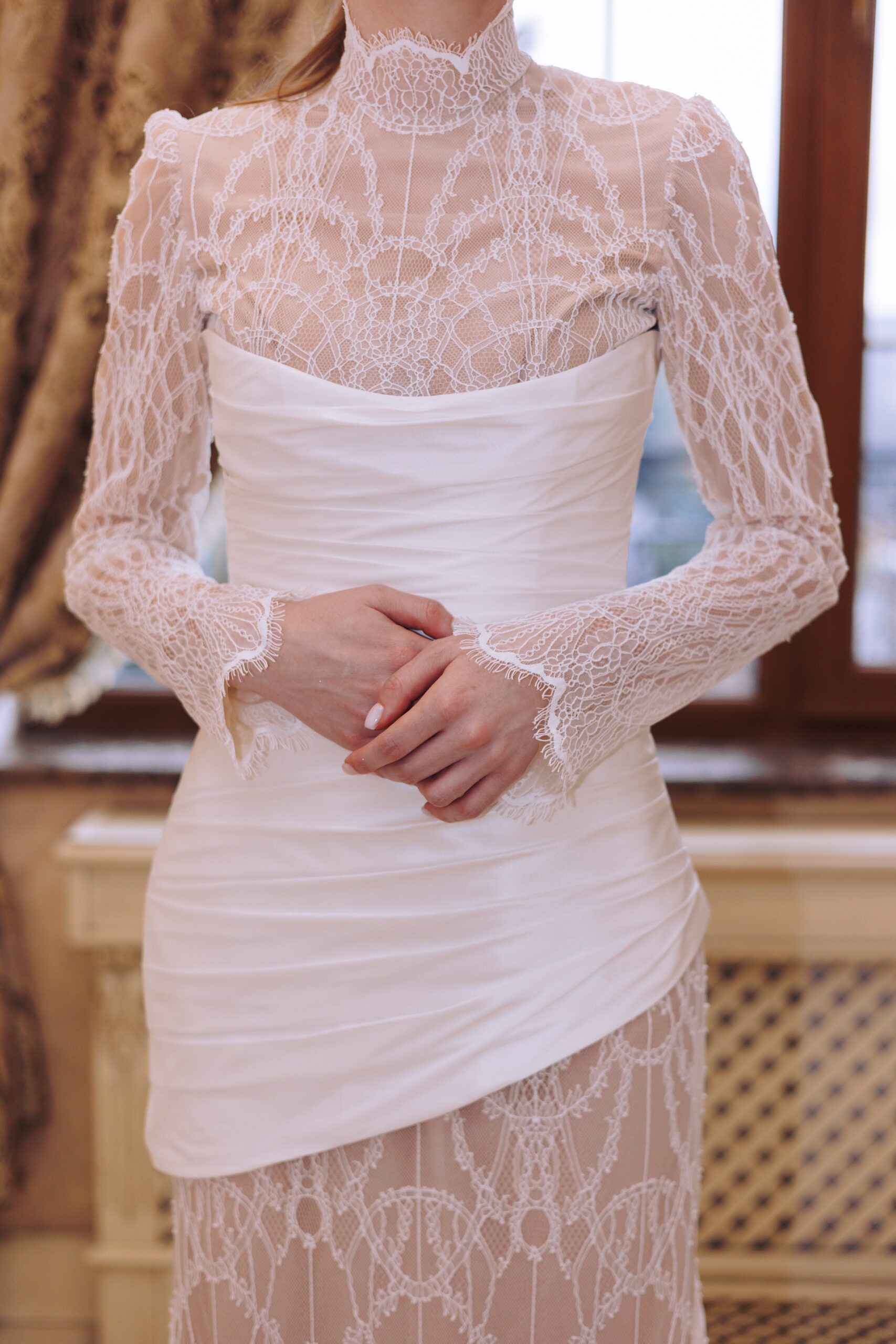 A high-neck lace wedding dress with long sleeves