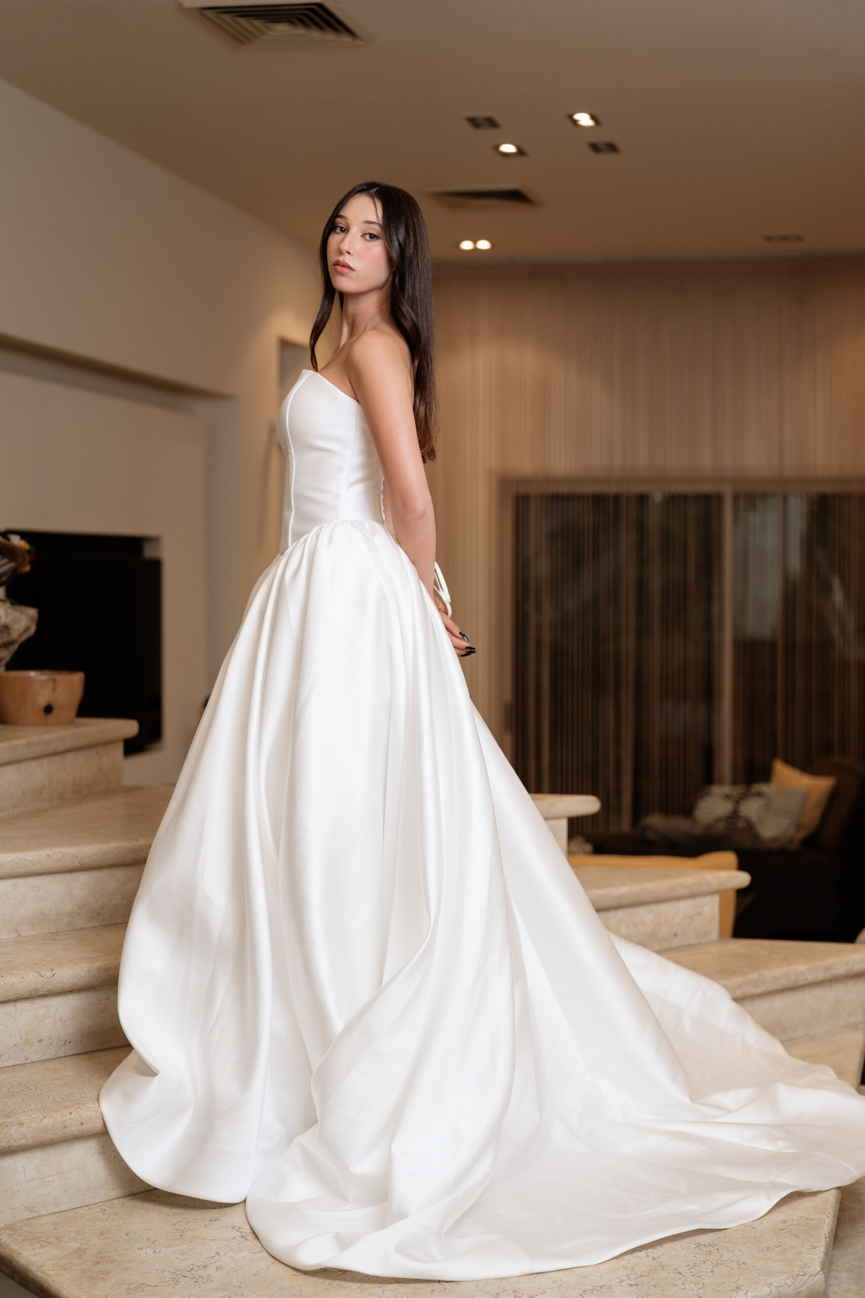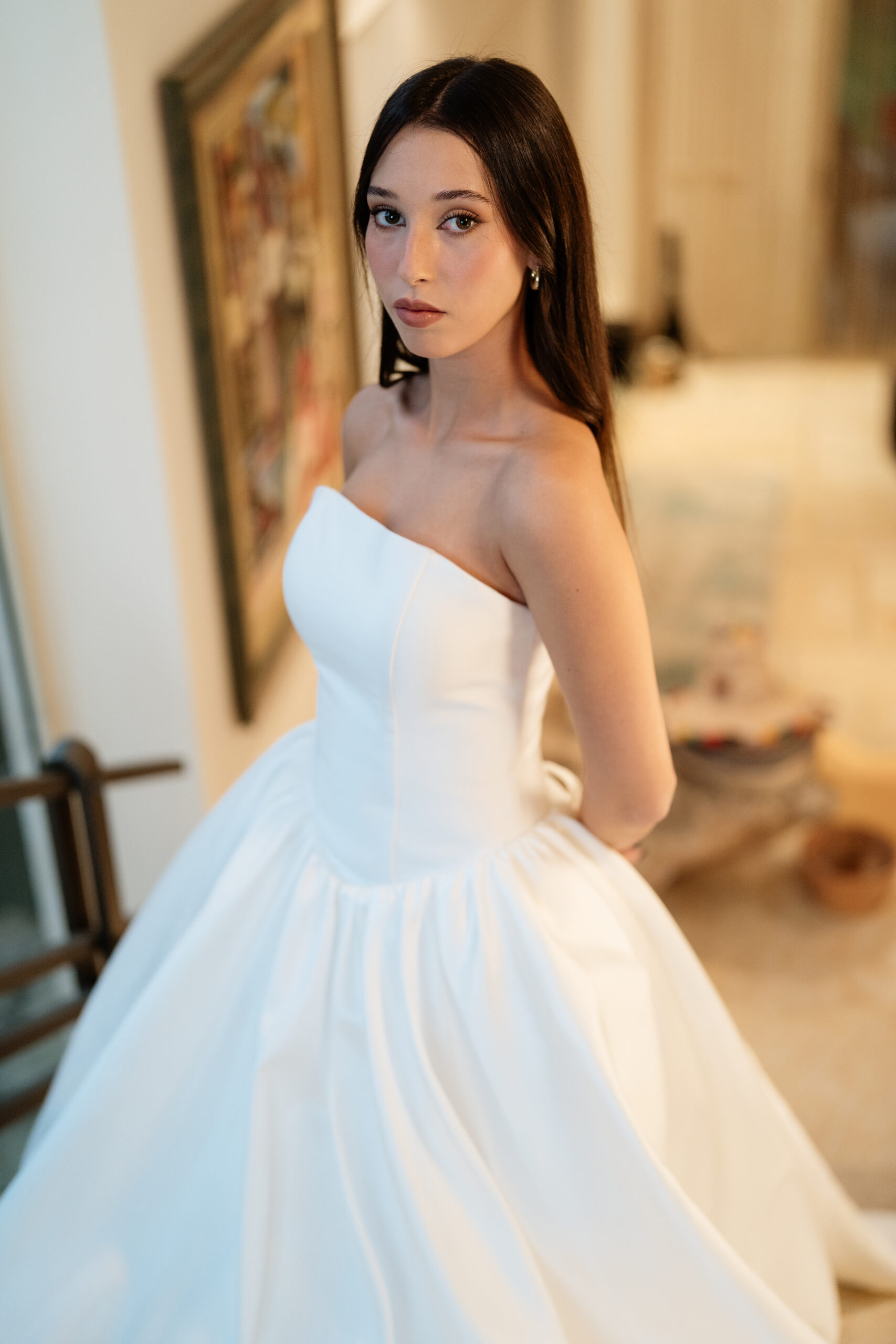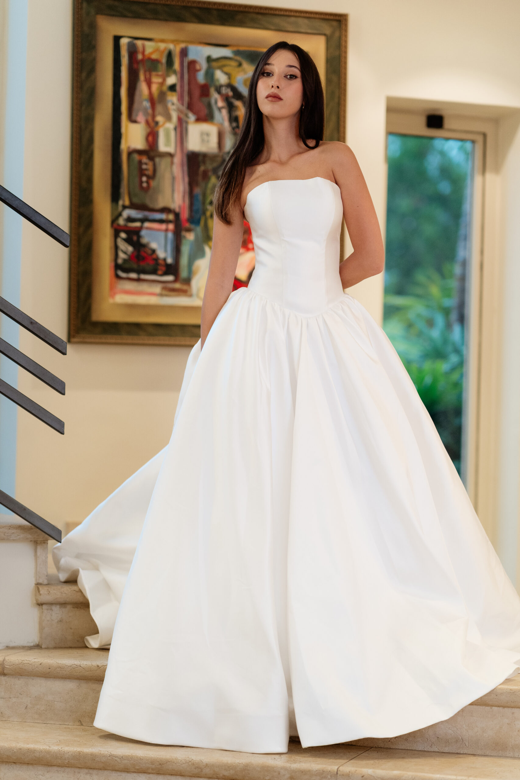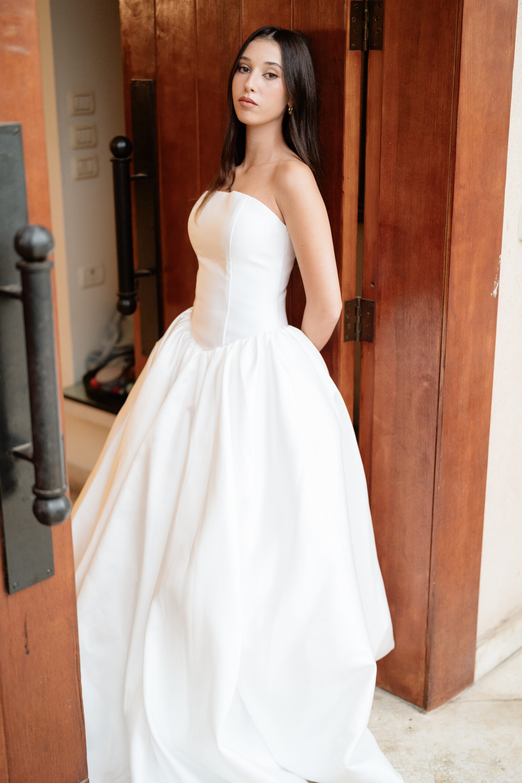 Flowing from the fitted bodice, the voluminous skirt drapes effortlessly to the floor, creating soft movement and a sense of timeless romance with every step. The minimalist design allows the craftsmanship and silhouette to shine, making this gown perfect for brides, formal occasions, or any moment that calls for quiet luxury.