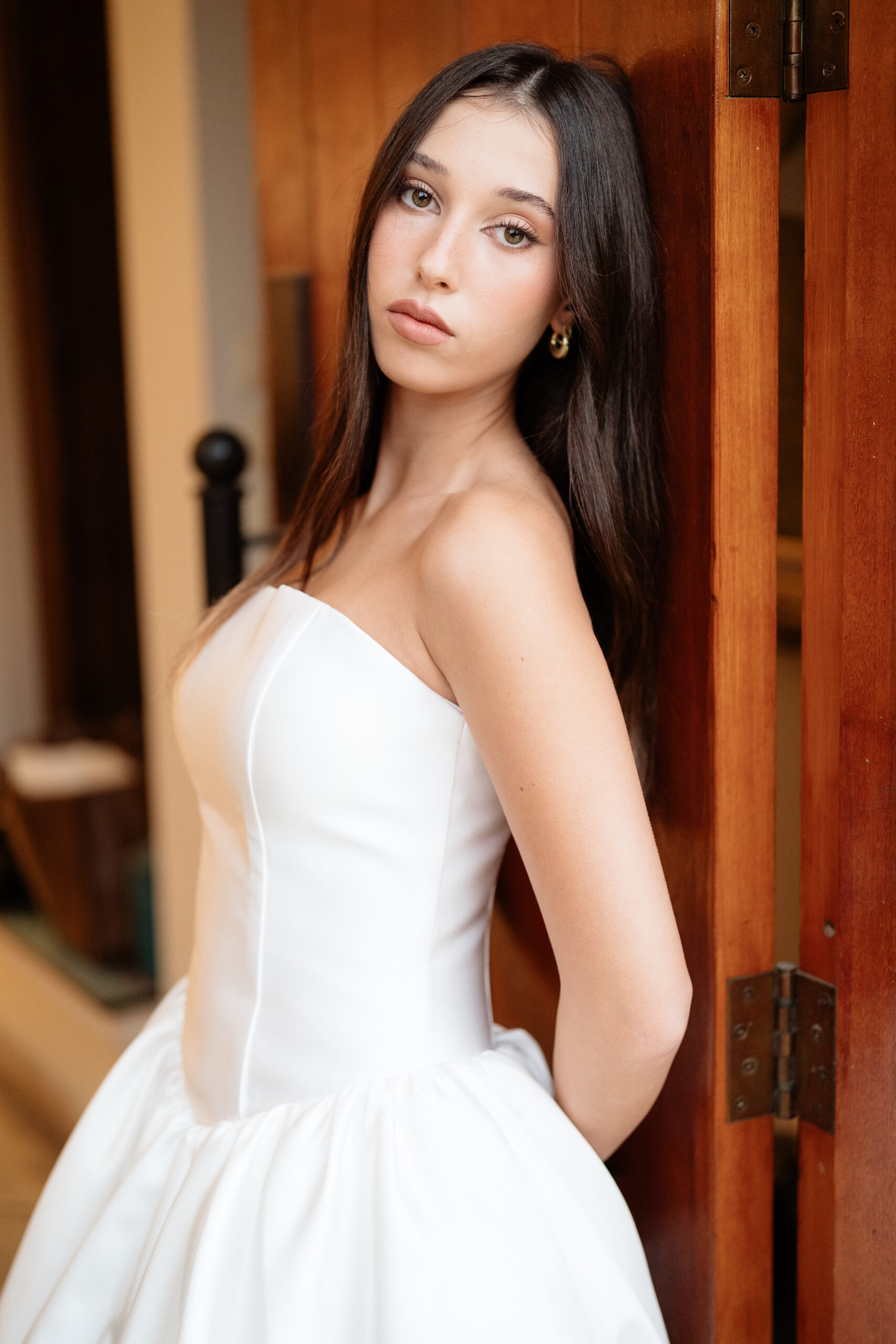 This exquisite strapless gown is the embodiment of modern elegance and refined simplicity. Crafted with a beautifully structured corset bodice, it offers a flattering, sculpted silhouette that enhances the natural shape while providing graceful support. The clean neckline highlights the shoulders and décolletage, creating a look that is both confident and understated.