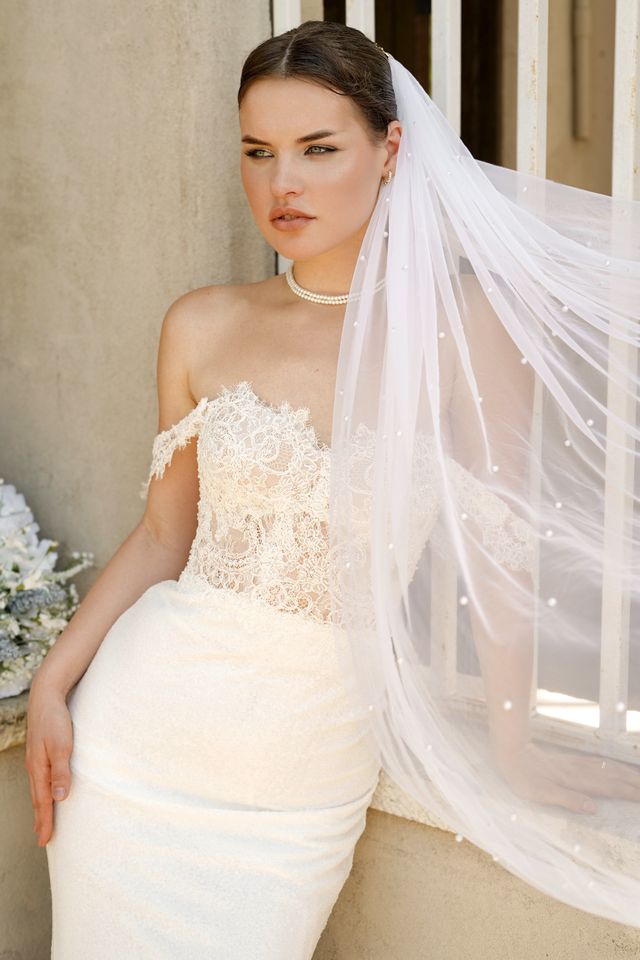 A sculpted, strapless silhouette with soft draping and a flowing train, blending classic bridal elegance with a bold, modern edge.
