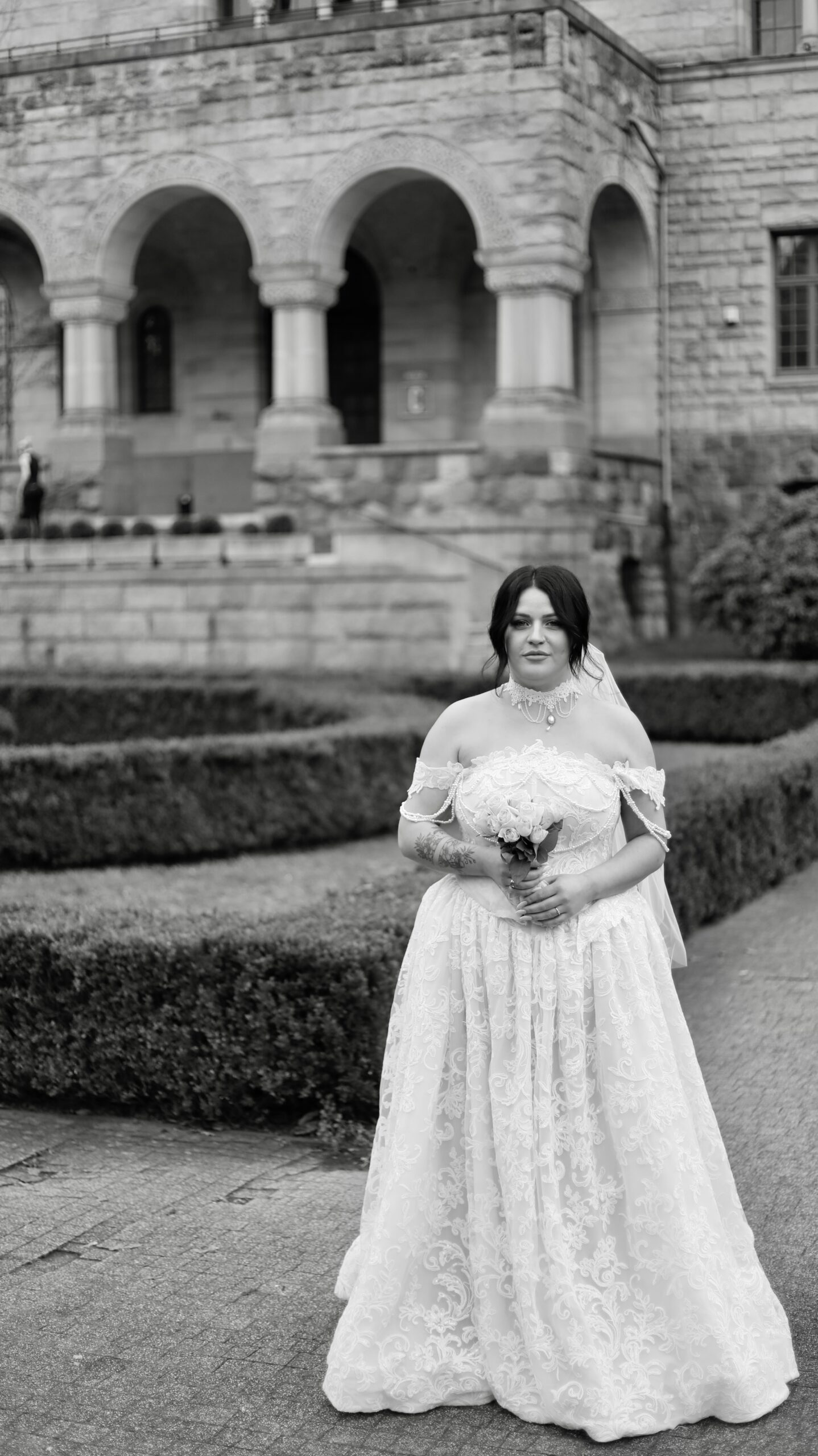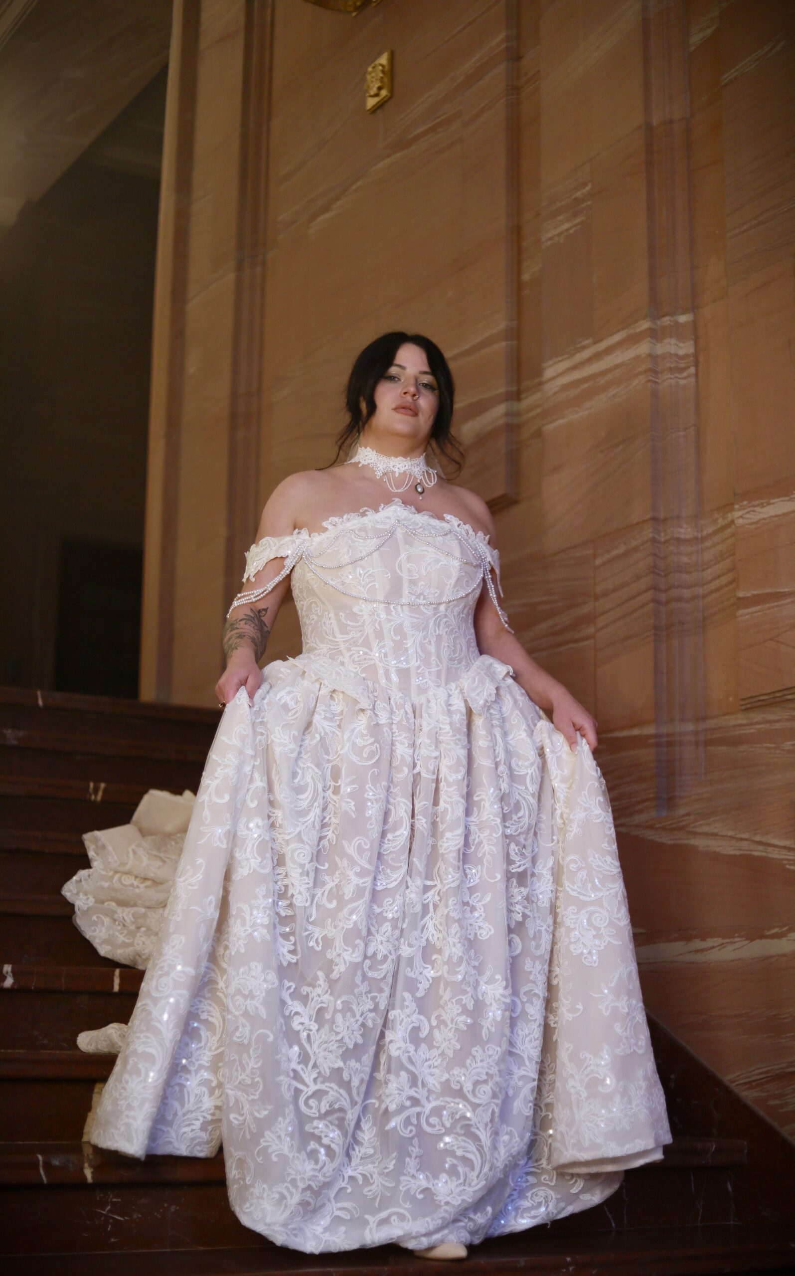 A strapless lace corset gown with a flowing tulle skirt designed for effortless romance and movement.