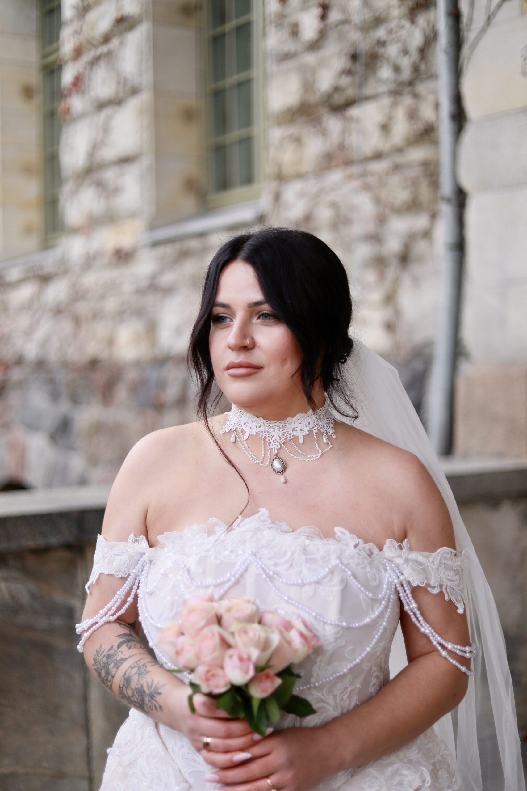 A romantic off-the-shoulder embellished gown with a sculpted silhouette and soft, ethereal elegance.