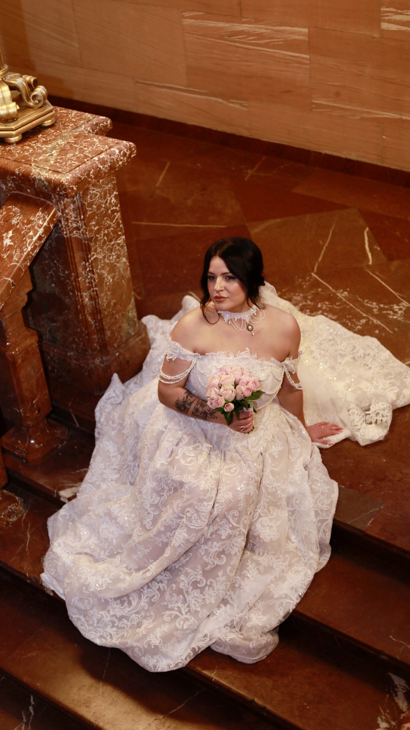 A poised woman in a strapless white gown stands in an elegant, softly lit interior, blending timeless sophistication with quiet confidence.