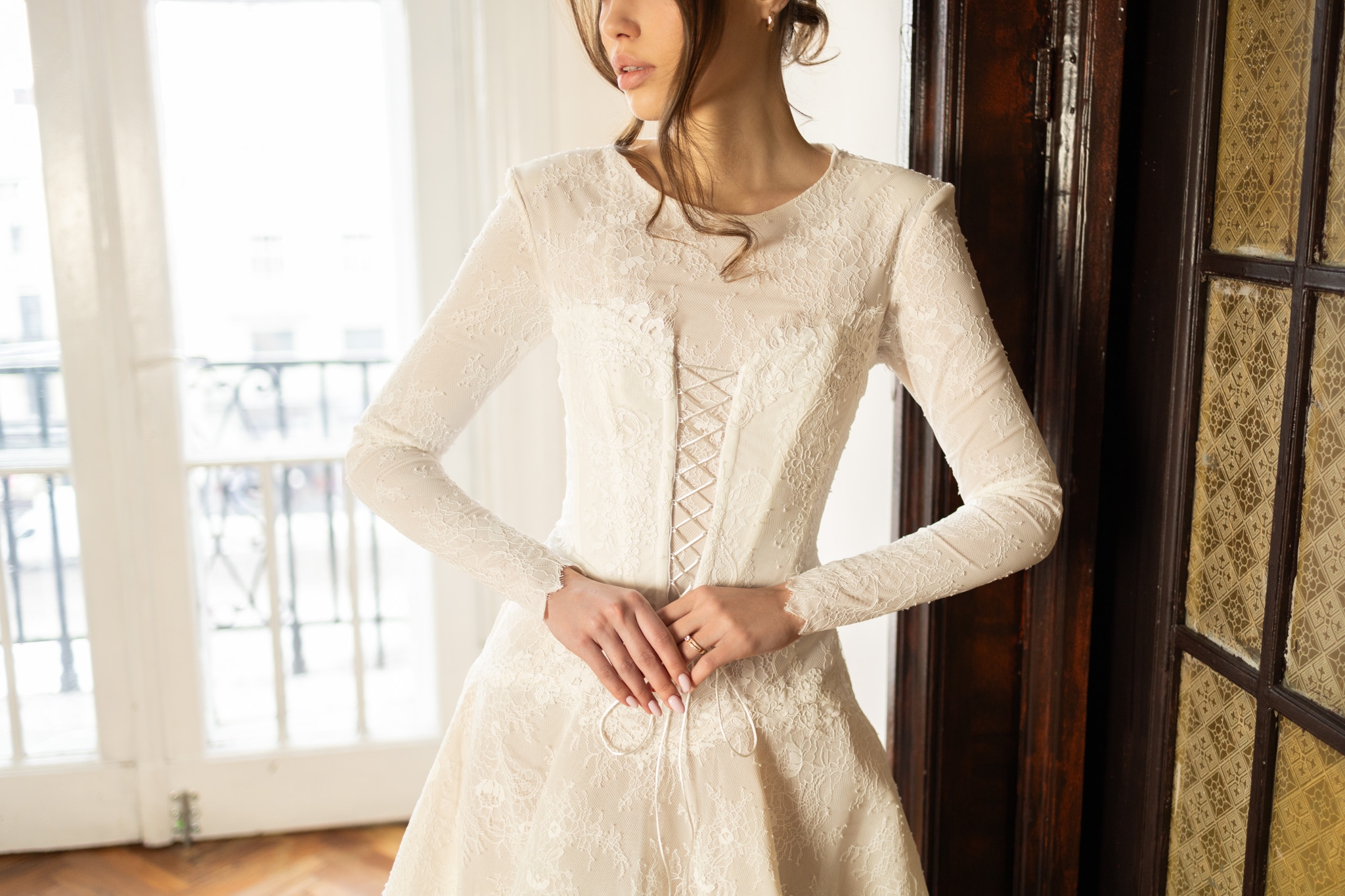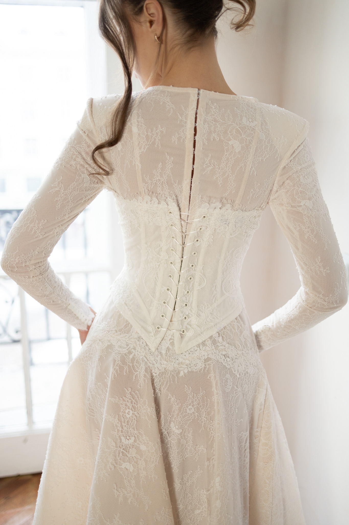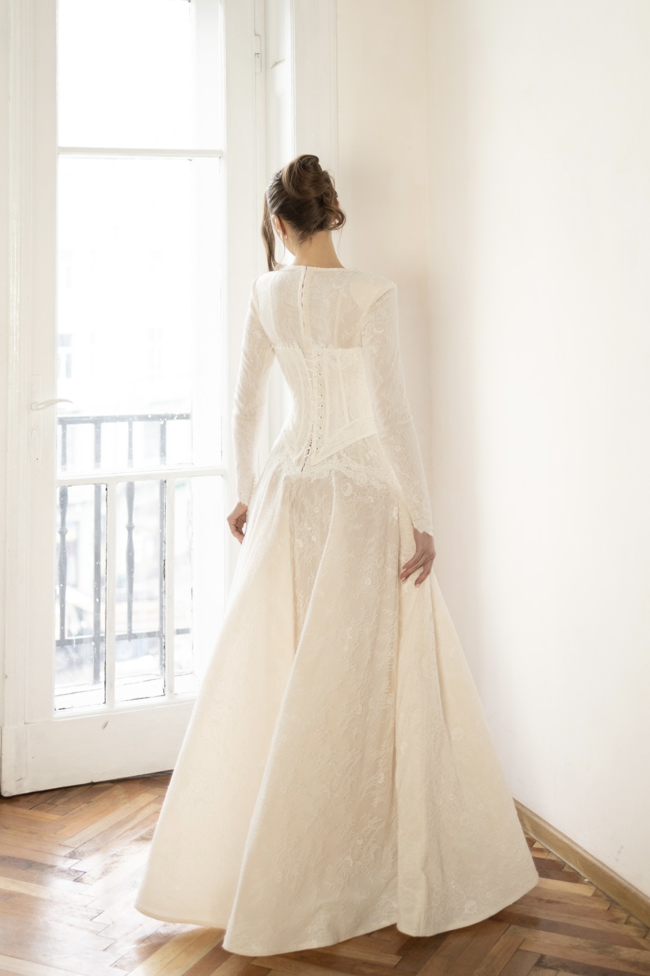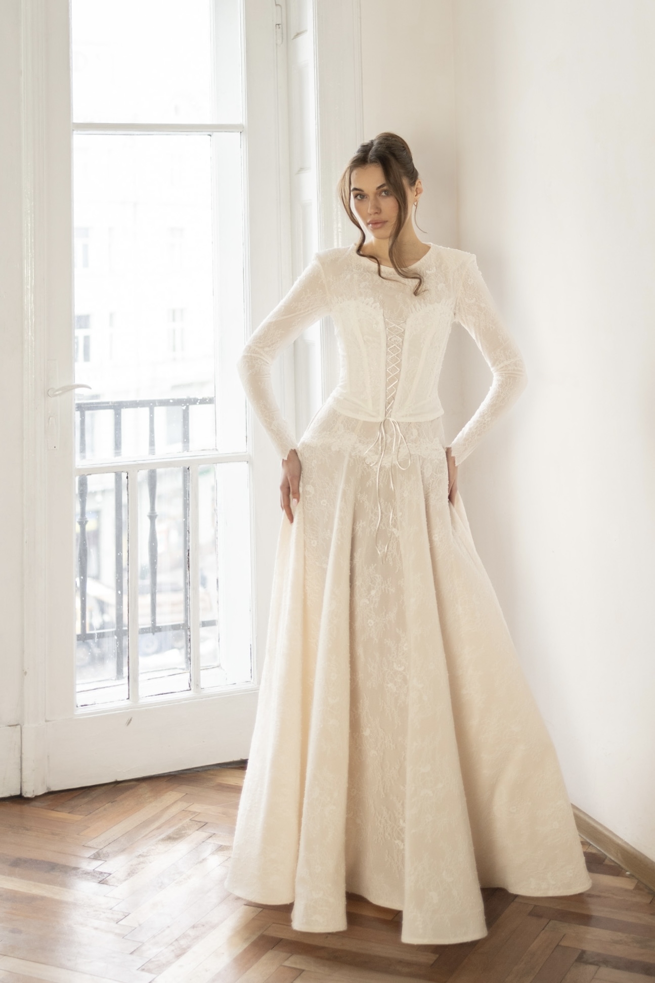 Leah is a timeless long-sleeve lace bridal gown featuring a structured corset waist and a full, flowing skirt. Romantic, refined, and effortlessly elegant.