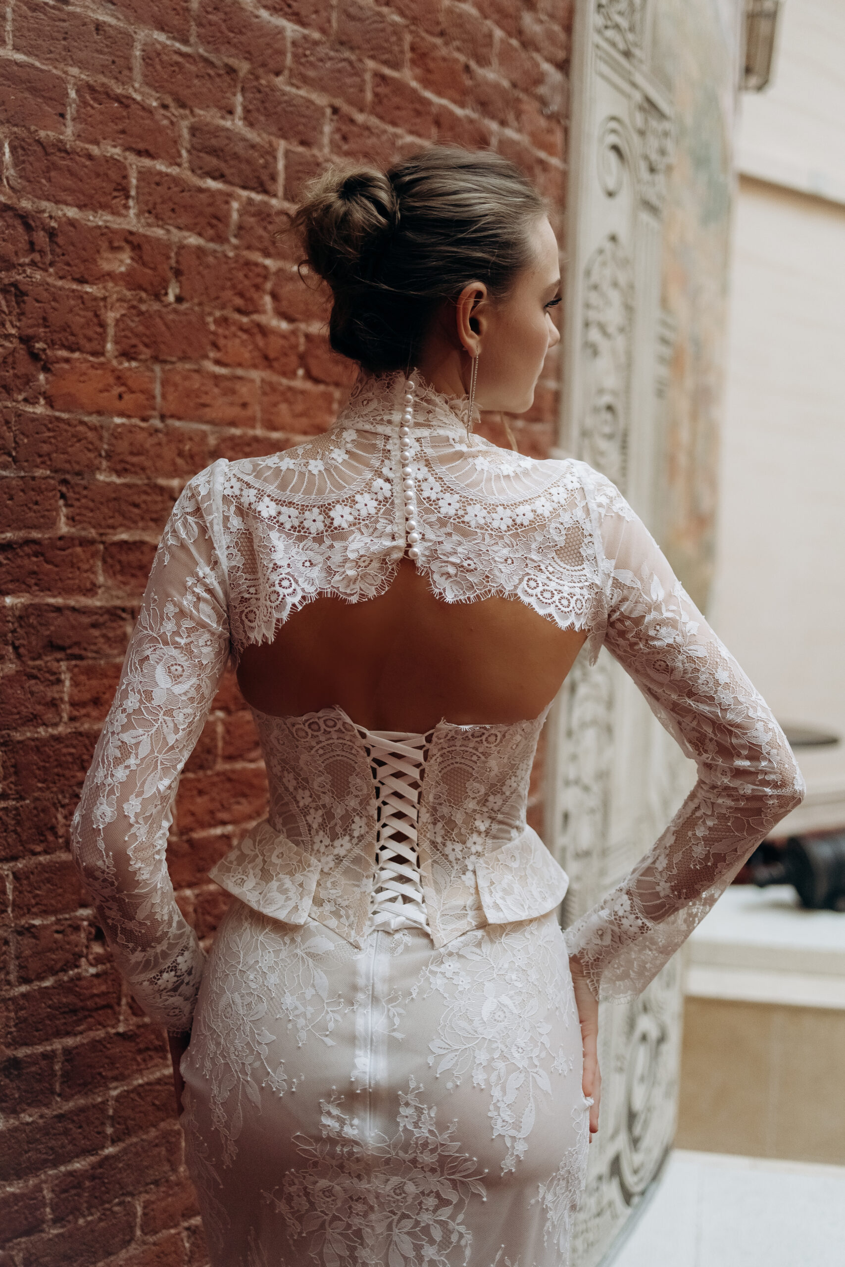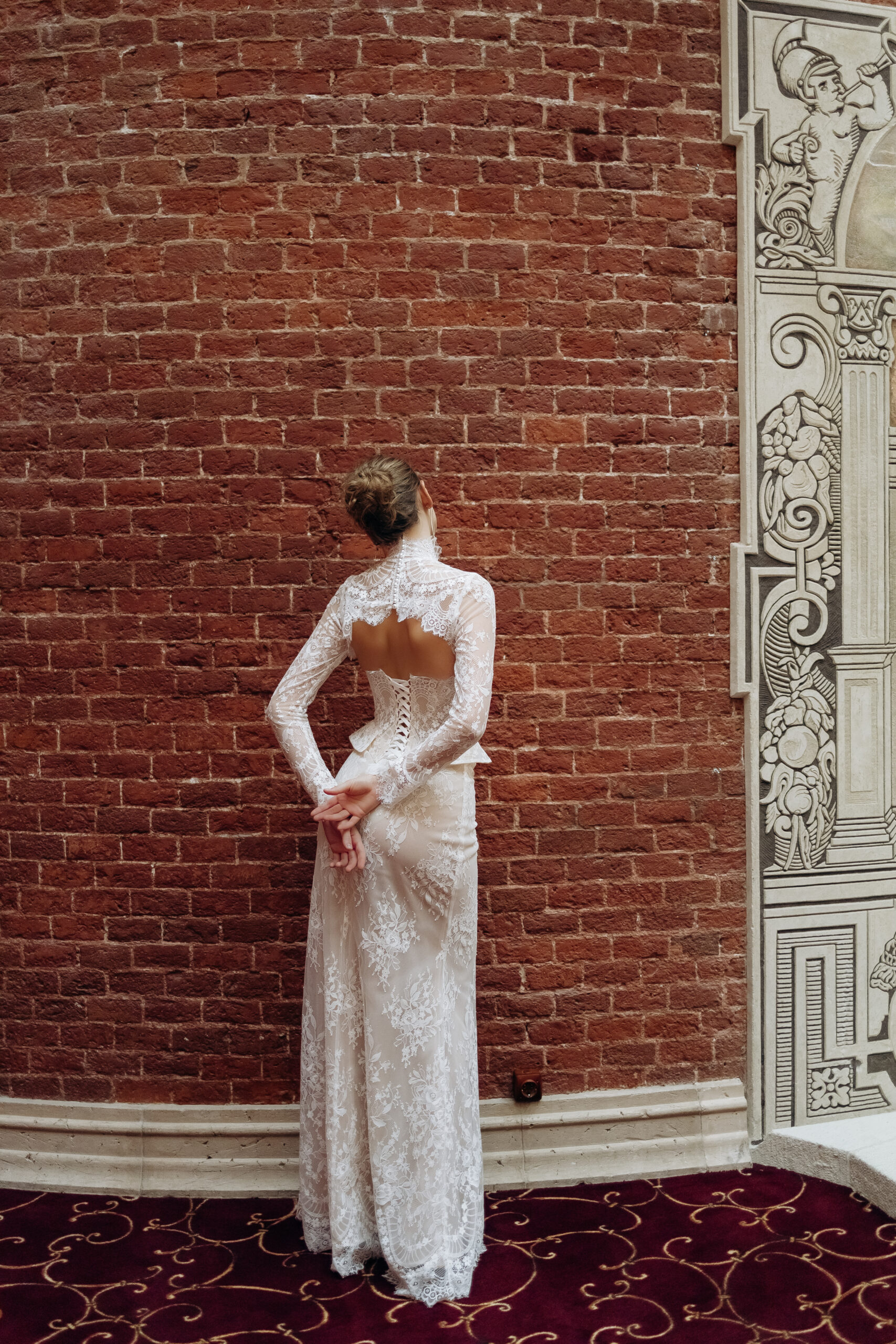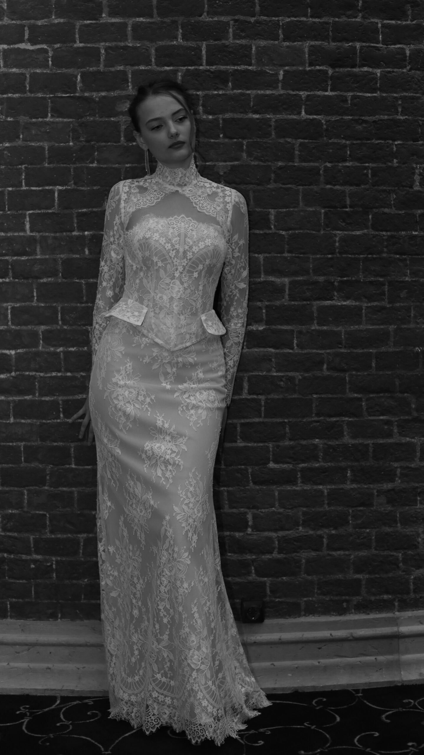 A high-neck lace bridal gown with long sheer sleeves and a sculpted corset silhouette, blending vintage romance with modern couture elegance.