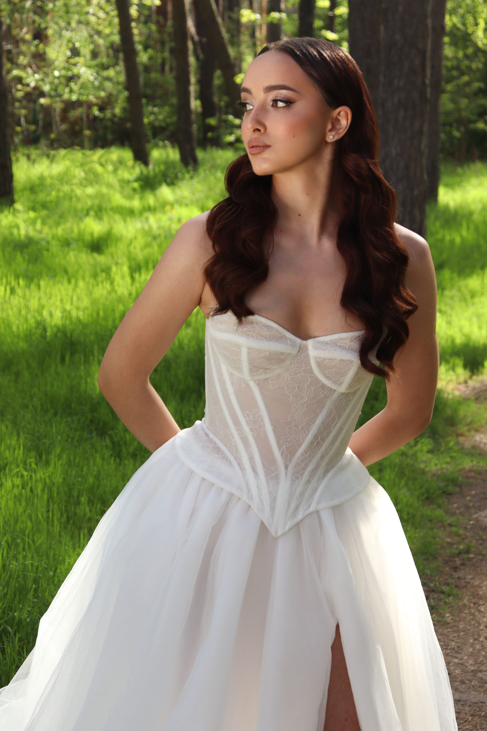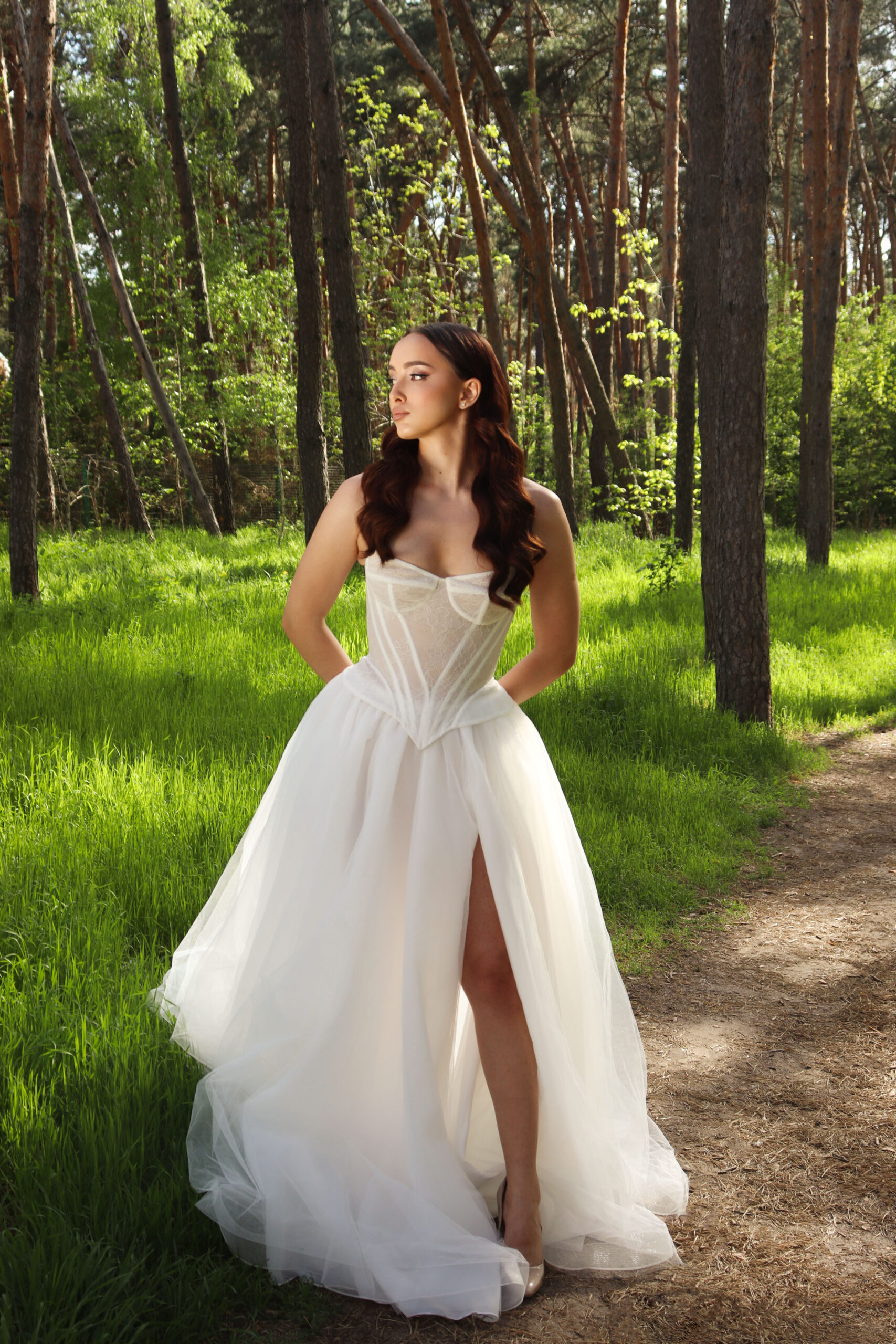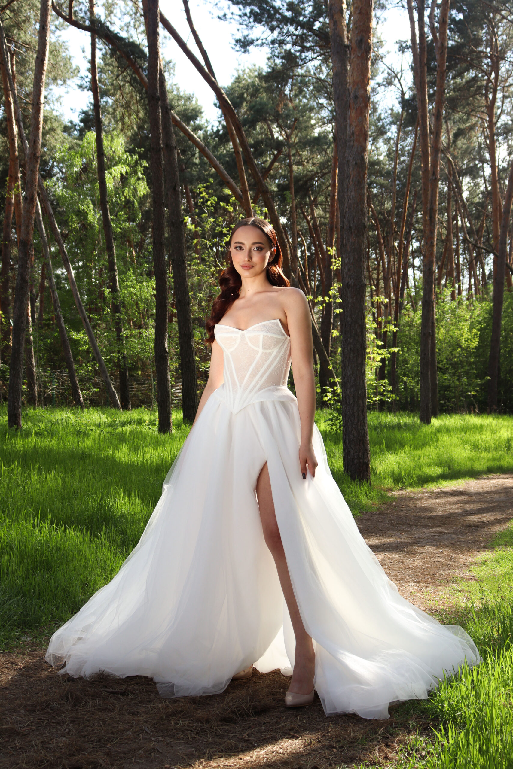 A strapless corset wedding gown with a flowing tulle skirt and bold high slit, combining modern structure with romantic movement.