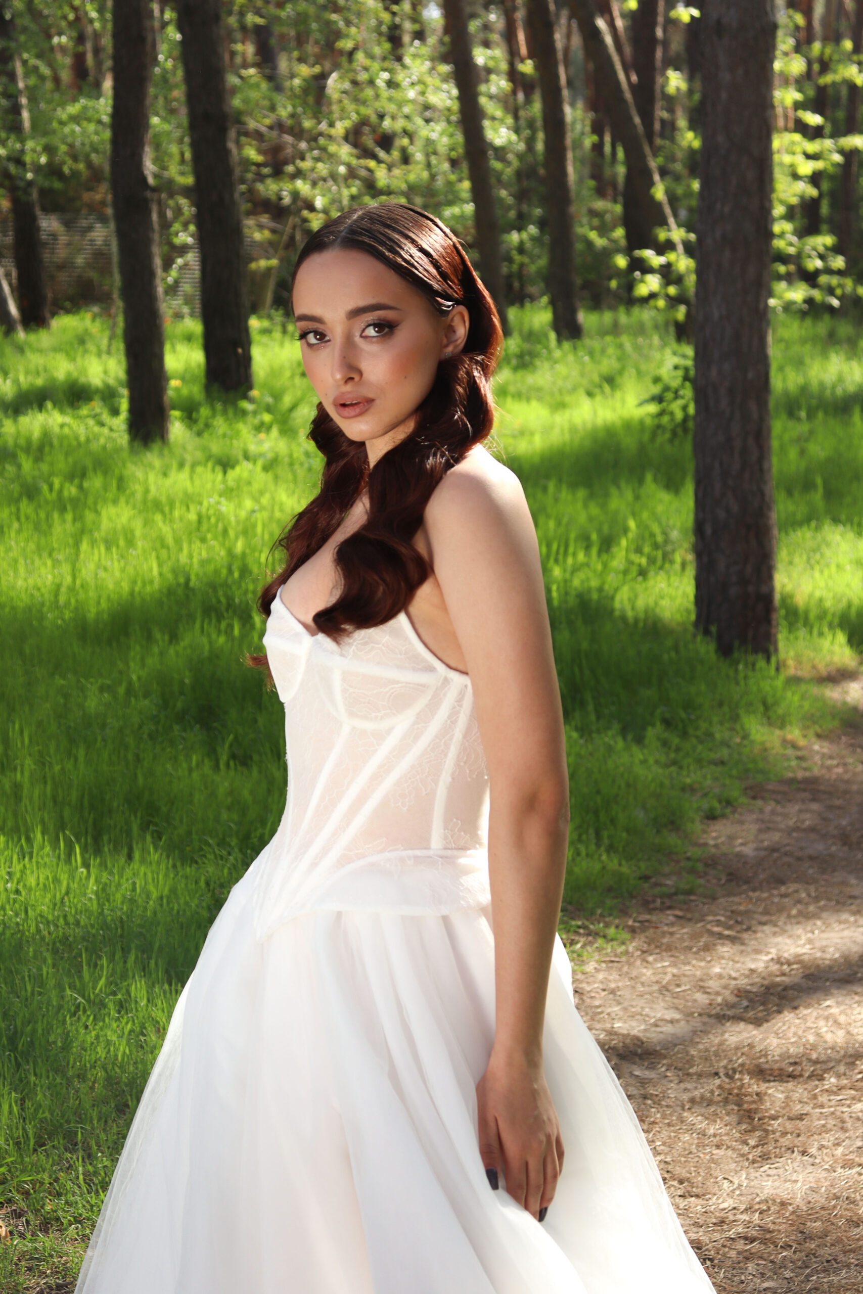 Noelle is a modern romantic bridal gown designed to make a bold yet elegant statement. The strapless corset bodice features clean architectural lines with sheer paneling and visible boning, creating a sculpted, flattering silhouette that highlights the waist and neckline.