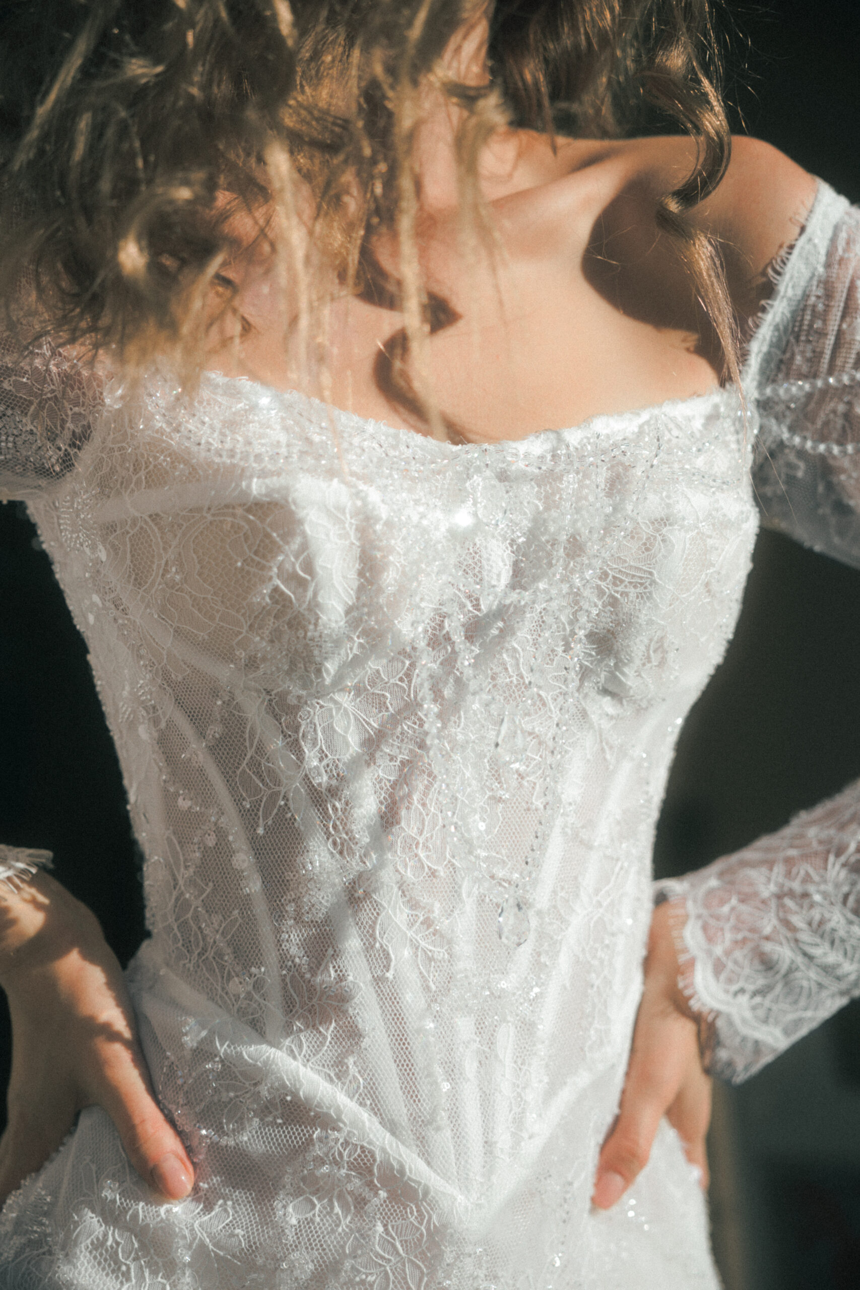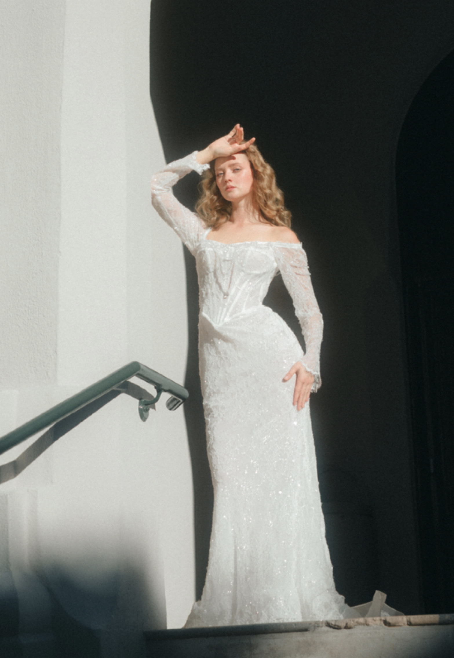 A woman wears an off-the-shoulder white gown adorned with delicate embellishments that softly catch the light. The fitted corset bodice and sheer long sleeves create a romantic, sculpted silhouette, while the straight skirt flows elegantly to the floor. Set against dramatic light and shadow, the pose feels graceful, artistic, and timeless.