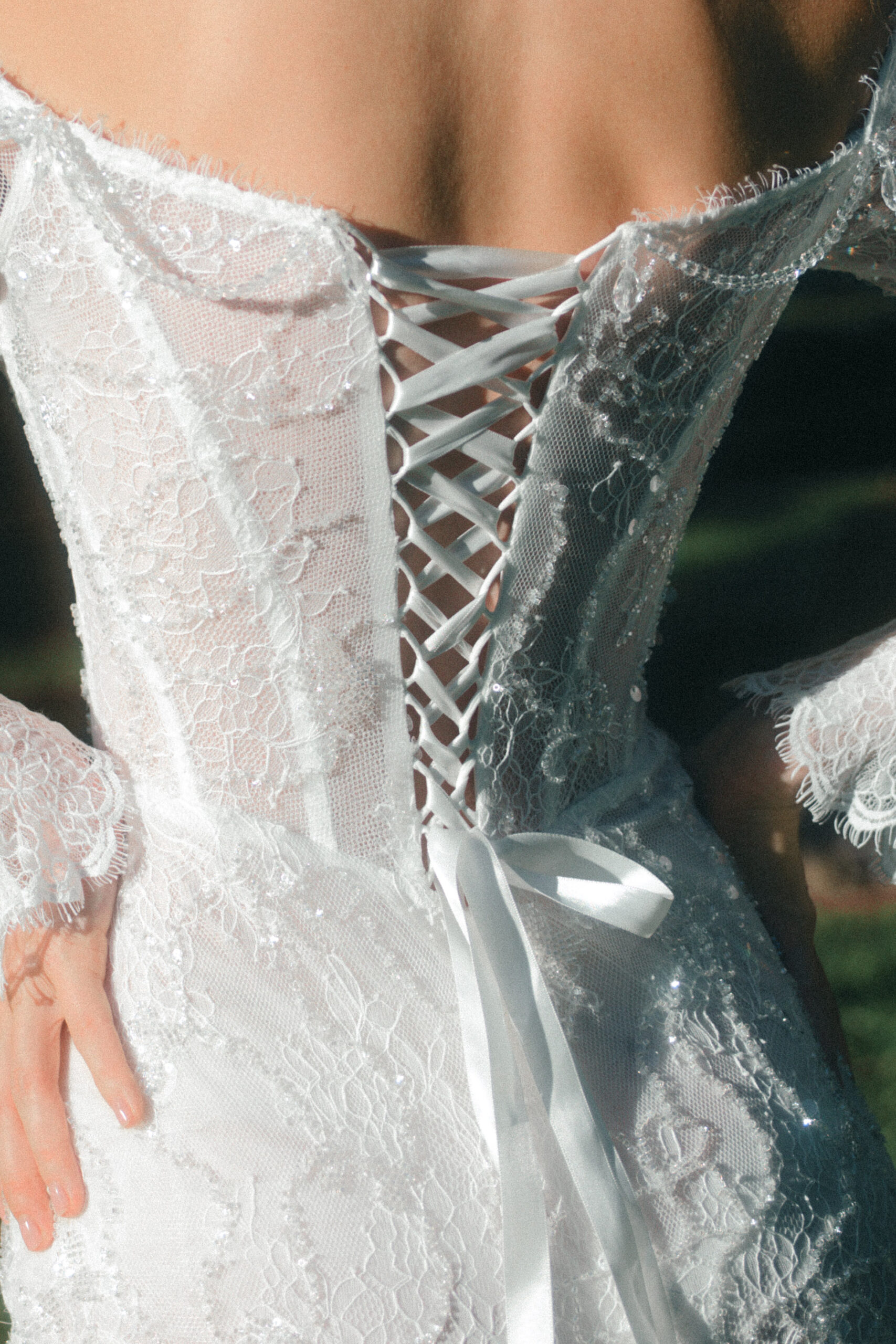 A high-neck lace bridal gown with long sheer sleeves and a sculpted corset silhouette, blending vintage romance with modern couture elegance.